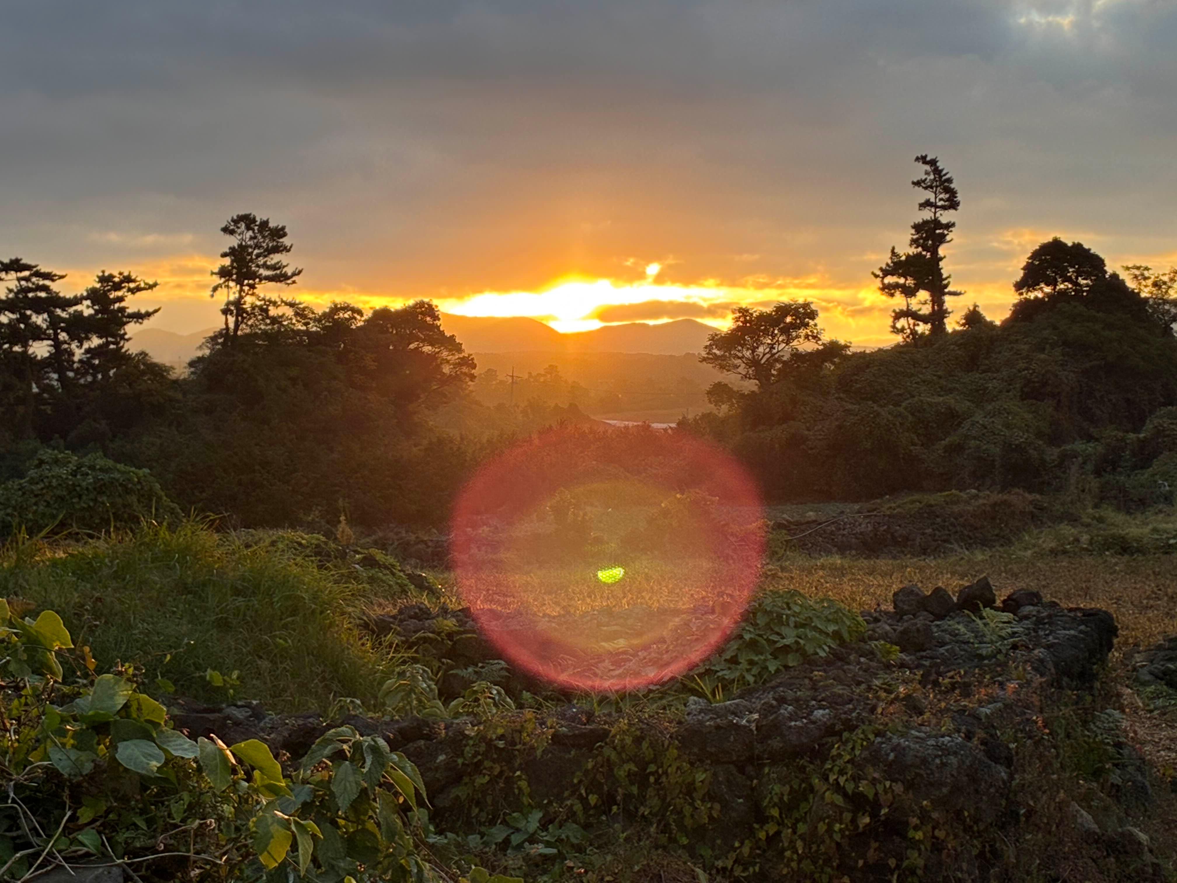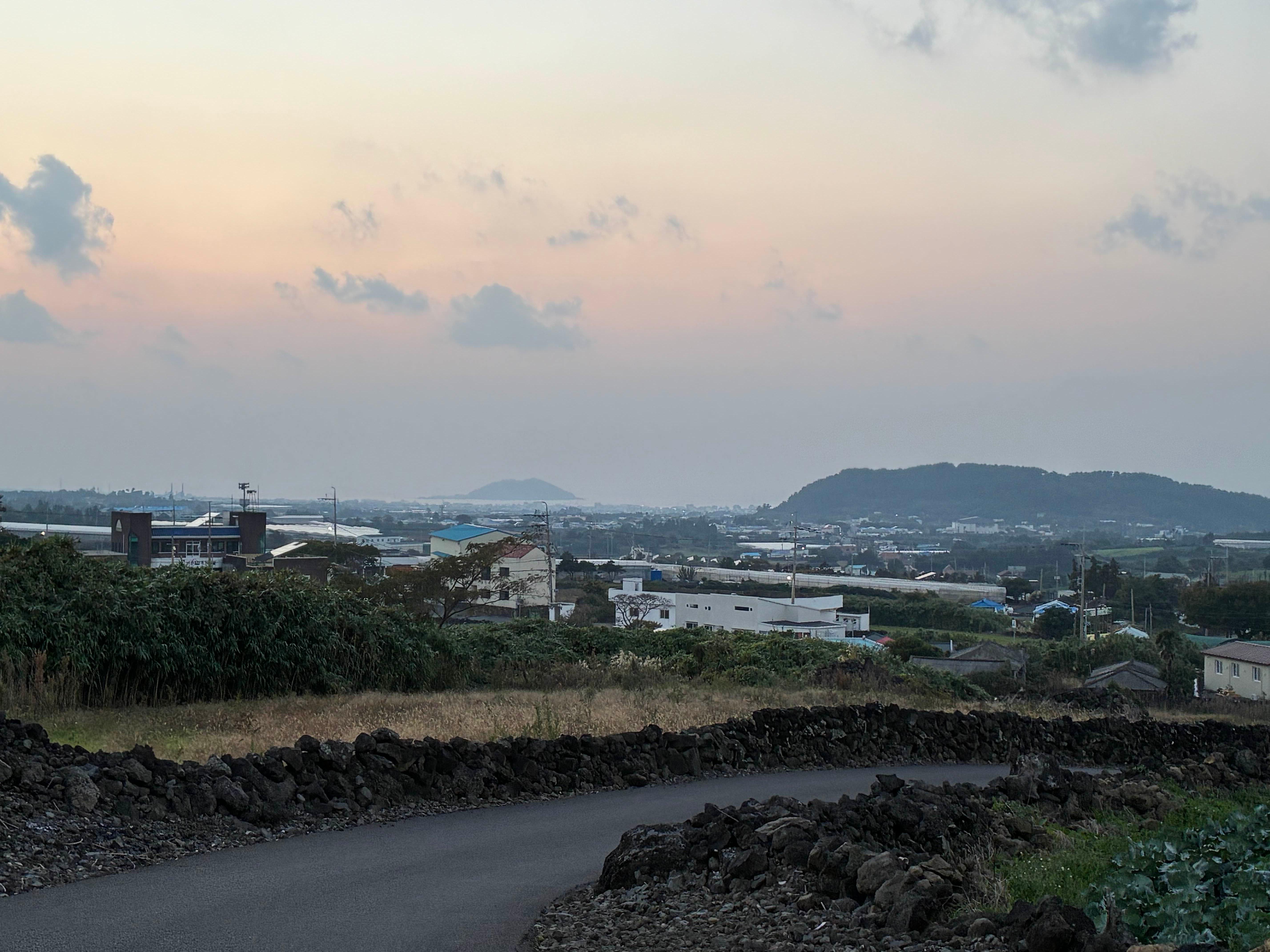 아침 산책을 하려고 숙소 뒤 언덕길로 올라가는데 마침 한라산을 배경으로 해가 뜨고 있었다.